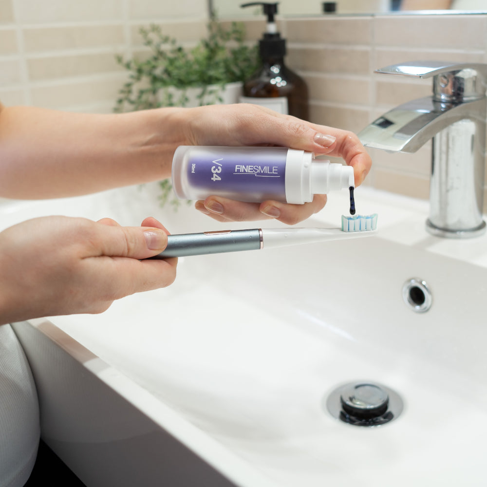 V34:s kombination av två vattenlösliga färger avlägsnar varje nyans av gult, så att du kan få det vitaste leendet utan att lämna några rester efter sig.